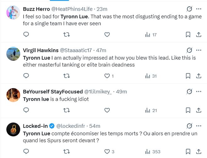 赛后不少的快船球迷都对泰伦卢不满,他们认为快船被逆转25分是泰伦卢的过错: