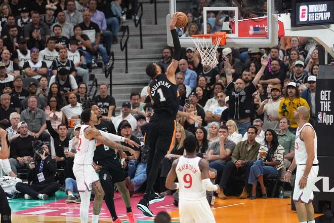下半场文班的防守实在太恐怖了,末节最后2分半他回来打,一个三分一个反击扣篮帮助马刺反超。