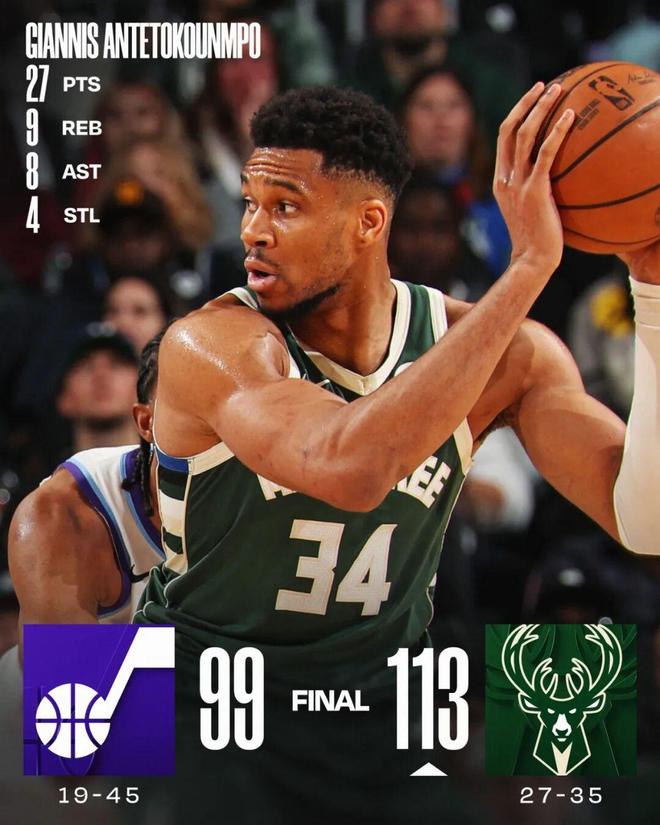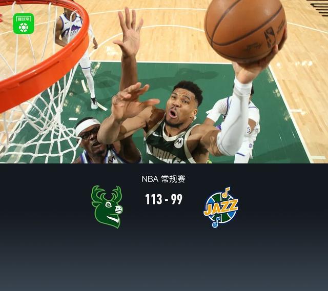 NBA战报:雄鹿113-99爵士,字母哥27+9+8